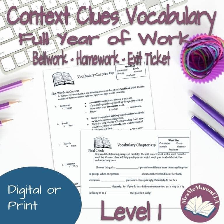 This full year of vocabulary curriculum comes with bellwork, homework and exit tickets for approximately 35 weeks of instruction. Including pre and post assessments, parent pages, 150 new words, and over 500 example sentences.